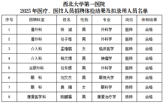 按照工作安排,西北大学第一医院2025年下半年医疗工作人员招聘笔试、面试和体检工作已经结束,现将结果公示如下: