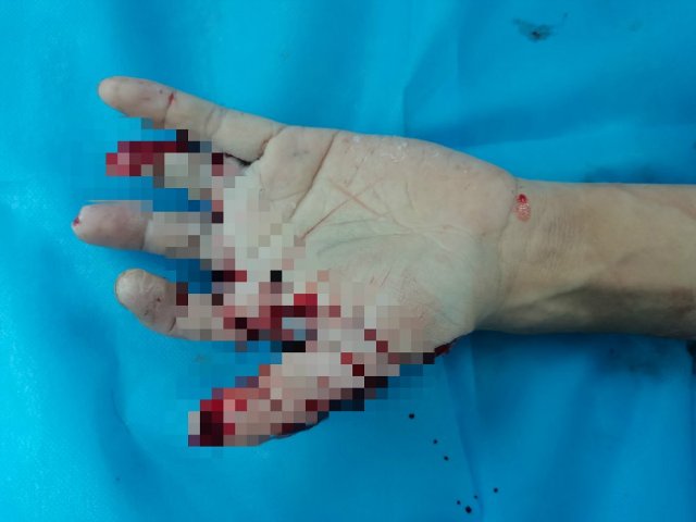 10月6日,20岁的小伙在工厂干活时左手不慎被切割机致左手拇指、示、中、环指完全离断;左小指开放伤伴肌腱神经血管离断;大鱼际皮肤软组织、环指中末节部分缺损、第一掌骨、第二掌骨部分缺损,鲜血直流。被工友慕名紧急送往我院骨二科进行救治。