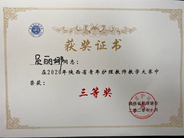 10月16日,由陕西省护理学会护理教育专业委员会举办的2020年护理师资临床思维实训班暨“第三届护理青年教师教学大赛”在西安举行。经过前期积极筹备,陕西省第四人民医院神经内科(卒中中心)护师员丽娜成功晋级决赛,经过激烈的角逐,最终荣获三等奖。