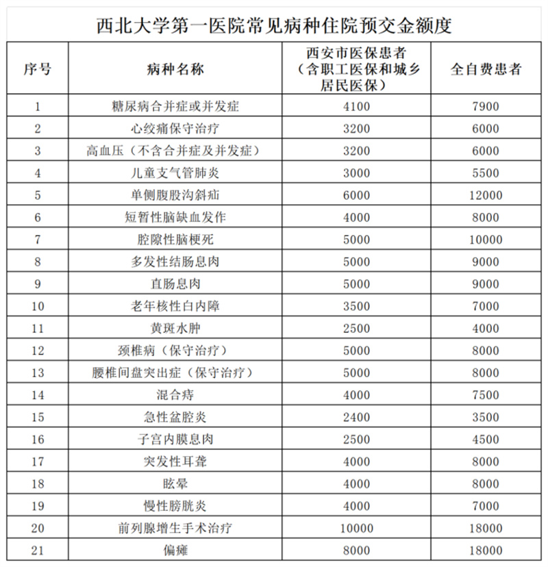 为规范住院预交金管理,切实减轻住院患者经济负担,不断提升群众就医体验,根据国卫办财务发﹝2025﹞5号《关于规范公立医疗机构预交金管理工作的通知》、陕西省卫健委关于印发《规范公立医疗机构预交金管理工作实施细则》的通知,我院根据近三年院内常见病种数据测算,现将相关住院预交金收费标准公示如下:
